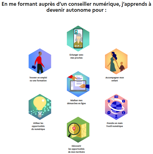 – Sensibiliser aux enjeux du numérique et favoriser des usages citoyens et critiques (s’informer et apprendre à vérifier les sources, protéger ses données personnelles, maîtriser les réseaux sociaux, suivre la scolarité de ses enfants, mieux comprendre les enjeux des IA, etc.)