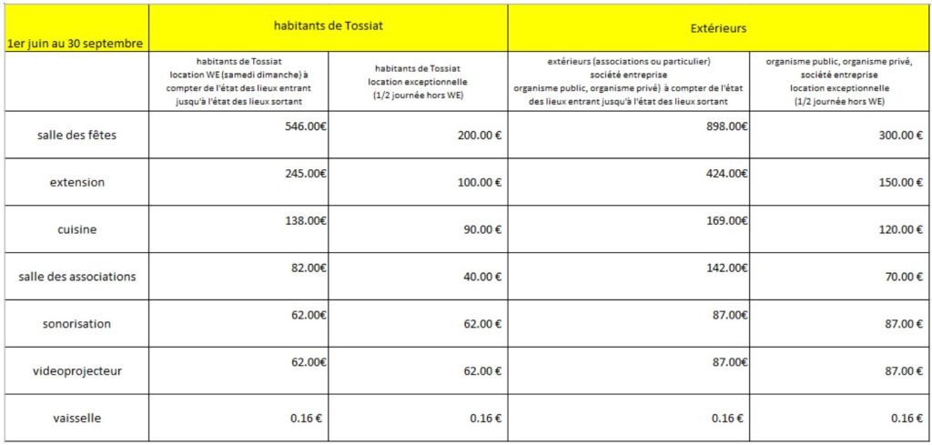 | Salle M. DERUDET : tarifs du 1er juin au 30 septembre | vendredi/samedi/dimanche/jours fériés et veille de jour férié | lundi/mardi/mercredi/jeudi |