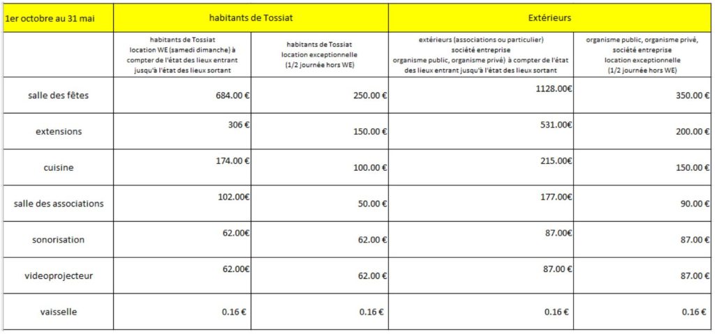La location est gérée par le secrétariat de mairie auprès duquel vous pouvez obtenir tous les renseignements nécessaires : planning d’occupation, tarifs, conditions de location.
